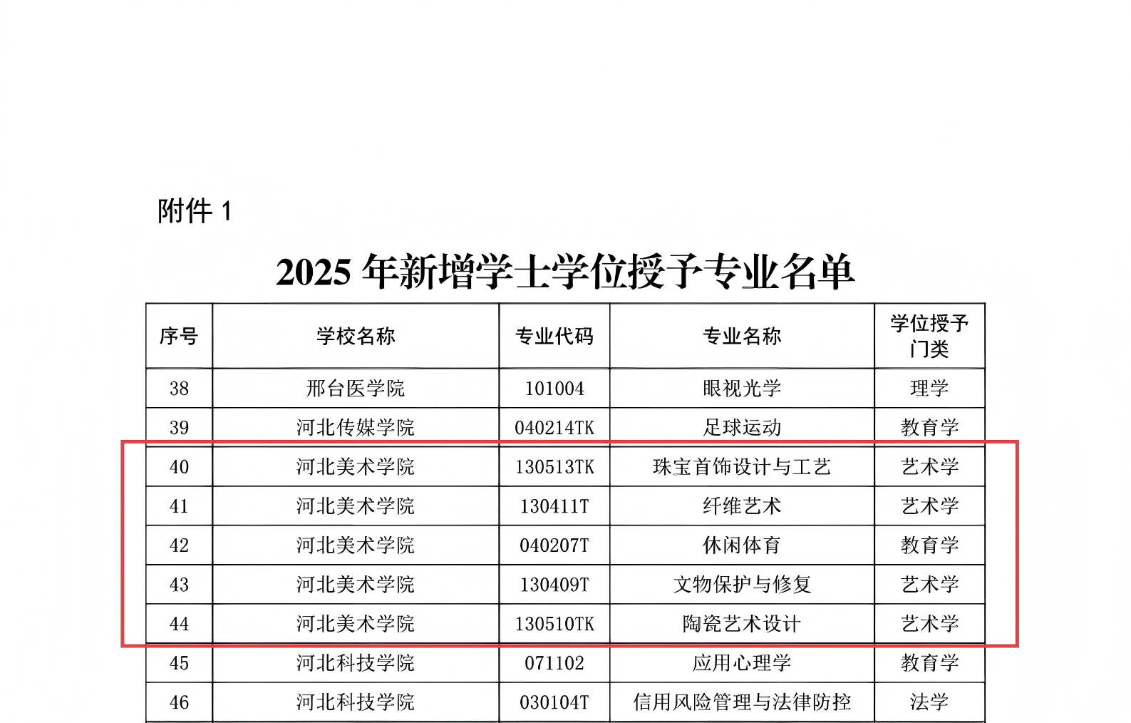 近日,河北省人民政府学位委员会印发《关于2025年新增学士学位授予专业的批复》(冀学位〔2025〕4号),学校珠宝首饰设计与工艺、纤维艺术、休闲体育、文物保护与修复、陶瓷艺术设计5个专业顺利通过学士学位授权审核。此次获批的5个专业中,珠宝首饰设计与工艺、纤维艺术、文物保护与修复、陶瓷艺术设计4个专业授予艺术学学士学位。休闲体育专业授予教育学学士学位,成为学校首个授予...