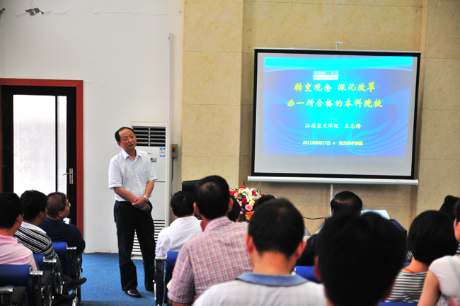 王院长以《转变观念,深化改革,办一所合格本科院校》为题,结合江西蓝天学院的成功办学经验及发展思路,重点阐述了新建本科院校如何办、民办本科教育面临的机遇和挑战等方面内容。王院长首先对新建本科院校科学发展面临的问题进行了深入分析,指出解决问题的主要途径是转变观念、深化改革,加强内涵建设;通过介绍合格本科院校的建设标准,以蓝天学院为例强调新建本科院校一定要找准办学定位,确立科学合理的人才培养目标和人才培养模式,加强学科专业建设;王院长还结合国家有关高等教育方针政策,分析了民办高等教育所面临的机遇和挑战,点出民办高校已撑起了中国高等教育的“半壁江山”,成为中国高等教育发展的一个重要增长点。