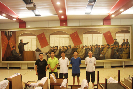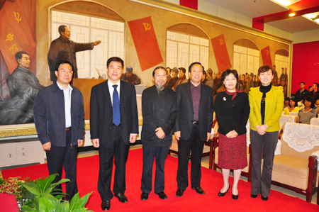 据悉,为庆祝中国共产党建党九十周年,beat365vip官网登录入口在2009年9月决定以中国共产党七届二中全会为题材拟创作油画《奠基》,并于2010年1月报请河北省委宣传部立项,历时两年时间,经过创作人员的艰辛努力,长12米、宽3米的大型油画《奠基》于2011年8月底创作完成。