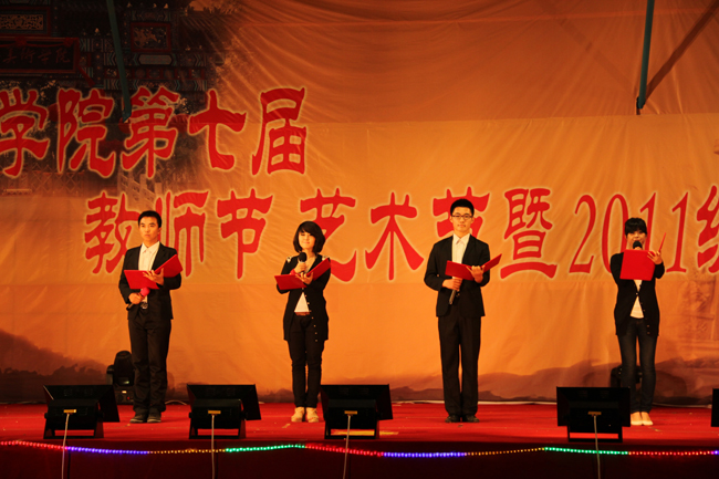 伴随着隆隆的敲鼓声,开场舞《祭孔》拉开了晚会的序幕。同学们通过新疆舞《半个月亮爬上来》、串烧《8090》、相声《论捧逗》及时尚的街舞等一系列精彩的节目,用优美的舞姿、动人的歌声向全校教师送去节日的祝福。一曲舞蹈《世纪相约》,跳出了当代师生活力四射的靓丽风采;一首诗朗诵《窗前的米兰》,用饱含深情的声音表达了同学们对老师辛勤工作和谆谆教诲的诚挚谢意,同时也将整台晚会推向高潮。晚会在充满青春活力的舞蹈《太阳颂》中落下帷幕。