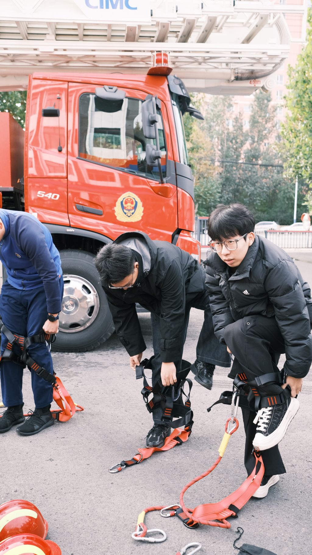 装备体验区点燃了大家的热情。“这个破拆钳看着不沉,握在手里才知道有多费劲!”一名男生试着提起液压破拆工具,脸都憋红了,消防员笑着上前指导:“它能快速破拆障碍物,关键时刻能救命,平时多练才能熟练使用。”大家对防毒面罩充满好奇,在消防员的帮助下戴好面罩,瞬间感觉呼吸困难,“戴着这个还要冲进火场,真的太不容易了”。穿上近30斤的消防战斗服时,大家刚站一会儿就浑身冒汗,有人打趣说“像裹了一层棉被”,可看着镜子里一身“火焰蓝”的自己,又忍不住挺直了腰板——这沉甸甸的重量,正是“赴汤蹈火”的责任与担当。登上高空作业车缓缓升起,辖区的街道、楼宇尽收眼底,消防员指着远处介绍:“现在我们不仅要灭火,还要应对地震、洪水等各类灾害,‘全灾种、大应急’就是要守护好每一寸土地。”