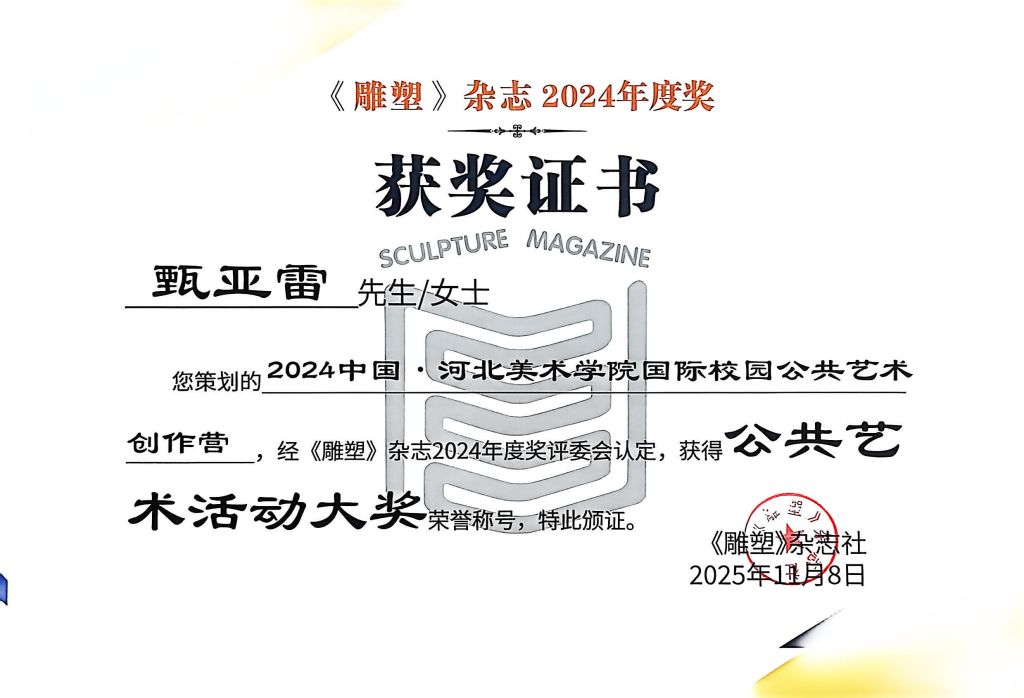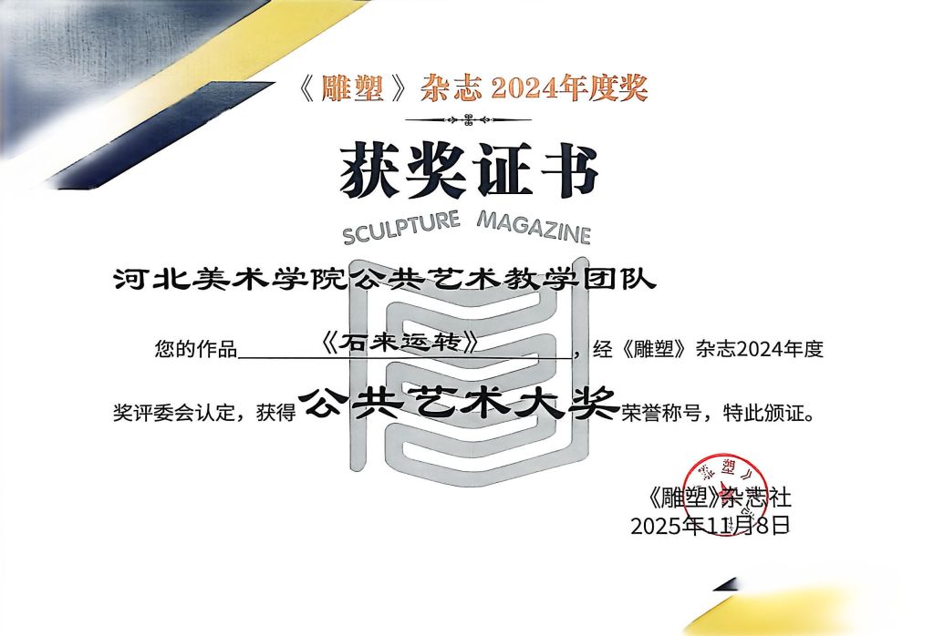 beat365分别获《雕塑》杂志2024年度奖公共艺术大奖1项(beat365vip官网登录入口公共艺术教学团队《石来运转》),公共艺术活动大奖1项(甄亚雷《2024中国·beat365vip官网登录入口国际校园公共艺术创作营》),原创雕塑大奖1项(刘庆《爆炸成形雕塑实验研究》)。另外,beat365终身教授郭宝寨荣获“国之大匠成就奖”。