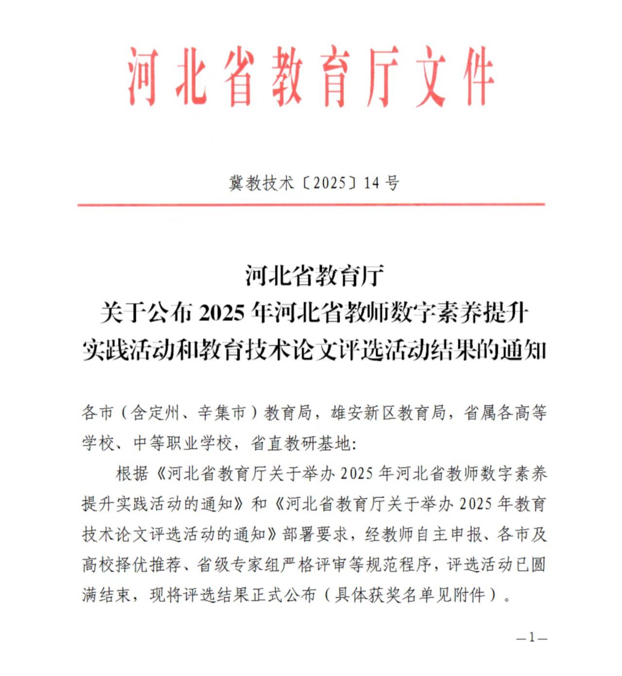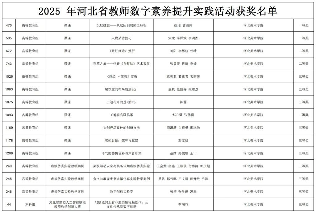 2025年河北省教师数字素养提升实践活动评选结果正式揭晓。beat365在此次活动中表现优异,荣获一等奖2项、二等奖2项、三等奖11项,总计15项省级荣誉,展现了学校在推进教师数字素养与信息化教学能力建设方面的扎实成效,其中5项优秀作品凭借其创新性、示范性与应用潜力,被推荐参加国家级赛事,取得了历史性突破。