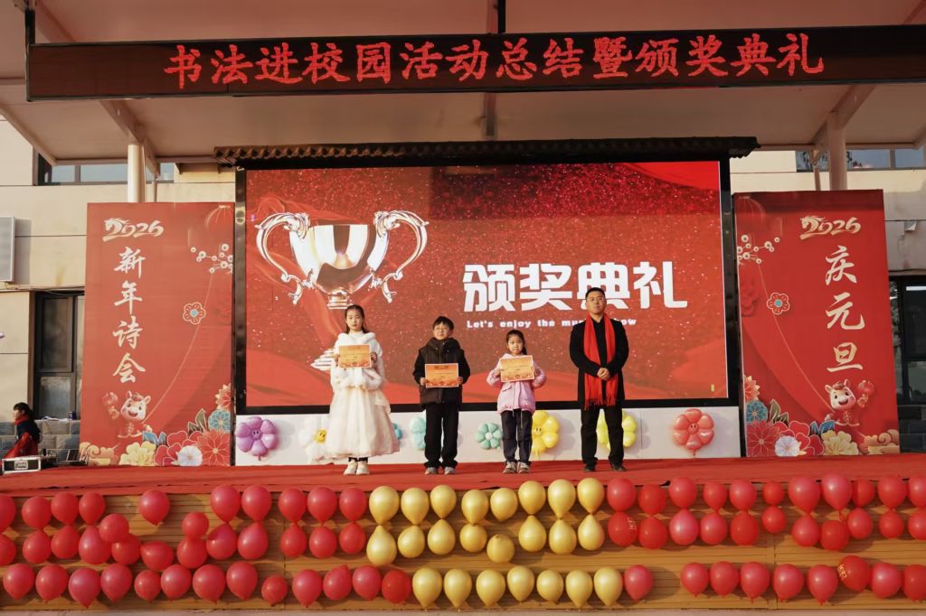 张政良、代晴、赵莲如分别为堽头小学期末书法比赛一、二、三等奖获奖学生颁奖;新乐市堽头小学校长为优秀支教志愿者代表颁发荣誉证书,向他们的辛勤付出致以诚挚谢意。