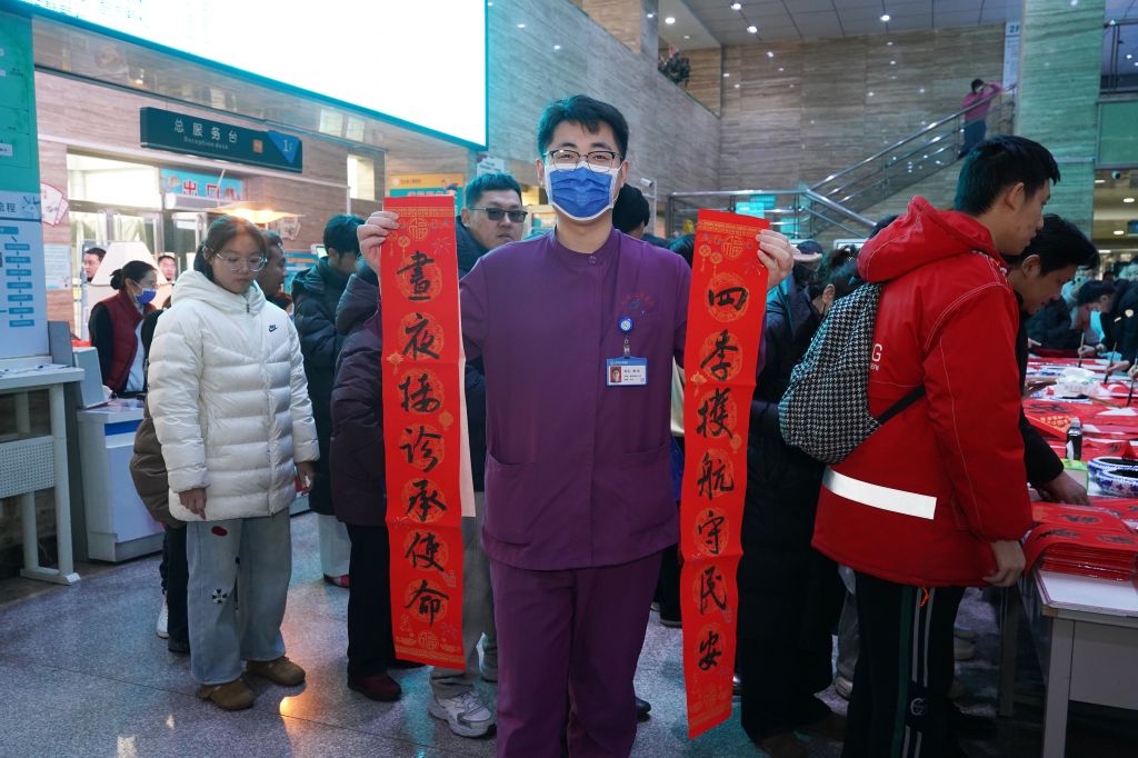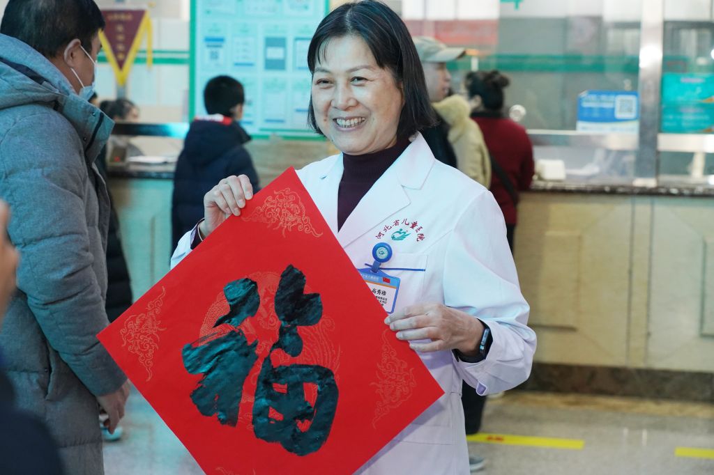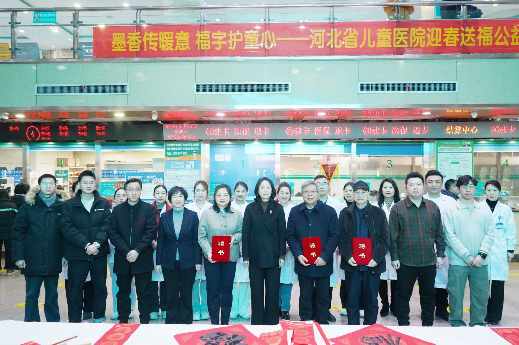 活动现场,中国书法家协会第七届副主席、河北省书法家协会主席刘金凯,河北省人力资源和社会保障厅原副巡视员傅国丰,beat365vip官网登录入口书法学院常务副院长侯东菊、副院长郭云鹏,河北省书法家协会理事、beat365vip官网登录入口书法学院教授成君,以及青年教师成欢、胡建刚、黄玺龙等现场挥毫泼墨。一幅幅笔力遒劲、寓意吉祥的 “福” 字与春联,不仅承载着对孩子们早日康复的祝愿和对医护人员的敬意,更让患儿在笔墨书香中感受艺术之美,让医护人员在文化熏陶中获得心灵慰藉,实现了美育疗愈与情感传递的双重价值。
