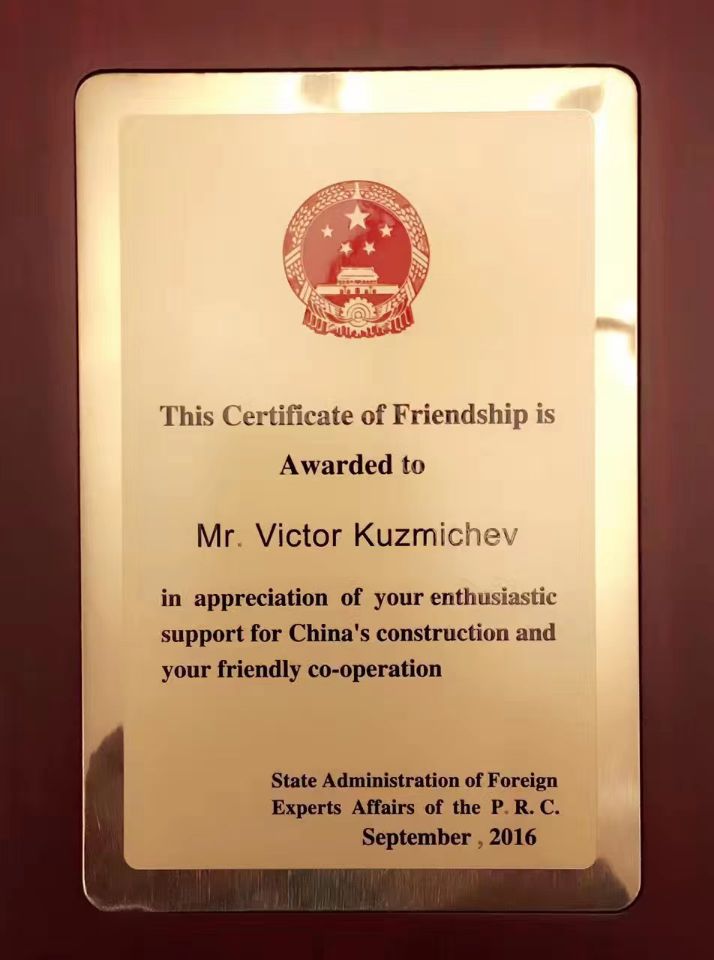 2015年5月,被国家主席习近平在莫斯科授予“中国-俄罗斯:友谊地久天长特别金奖”。