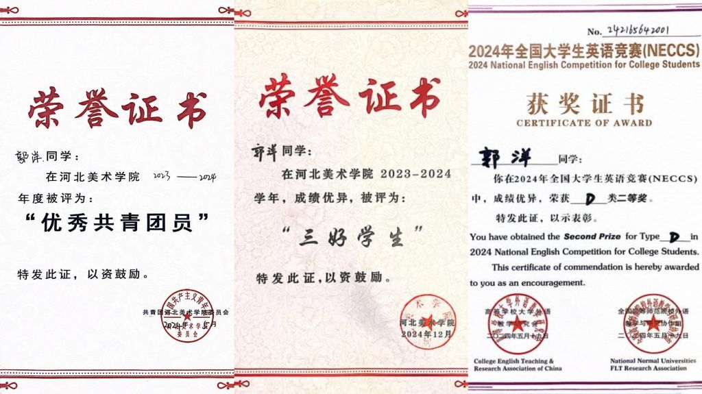 在学科竞赛的舞台上,她的才华更是熠熠生辉:6项国家级、2项省级、11项校级奖项,是汗水浇灌出的果实。“国青杯”全国高校艺术设计展评的国家级二等奖,2025年中国当代大学生艺术年鉴的入选作品(已被知网收录),乃至省级书画展上亮相的绘画创作,每一笔都藏着她对艺术的执着。