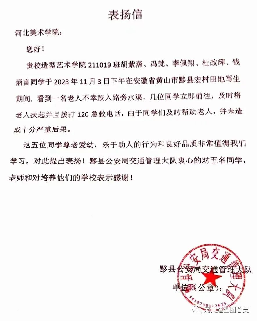 后来,当地交管部门特地给学校发来了表扬信,为这五位同学见义勇为的行为表示感谢。