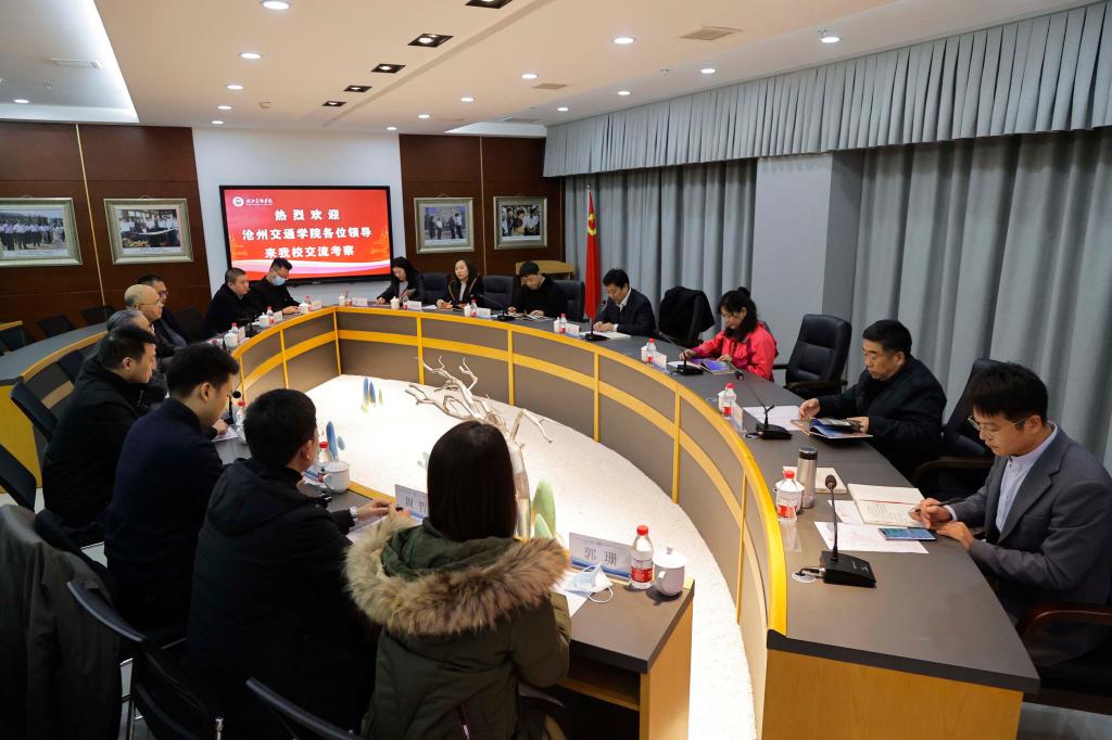 11月23日,沧州交通学院校长张力,党委书记、政府督导专员庞更新等一行7人在河北科技大学副校长张丹参的陪同下来beat365进行考察交流。校领导甄忠义、高国忠、张子言、甄心恒、甄墨、麻立峰及相关单位负责人在新综合楼318会议室接待来宾。