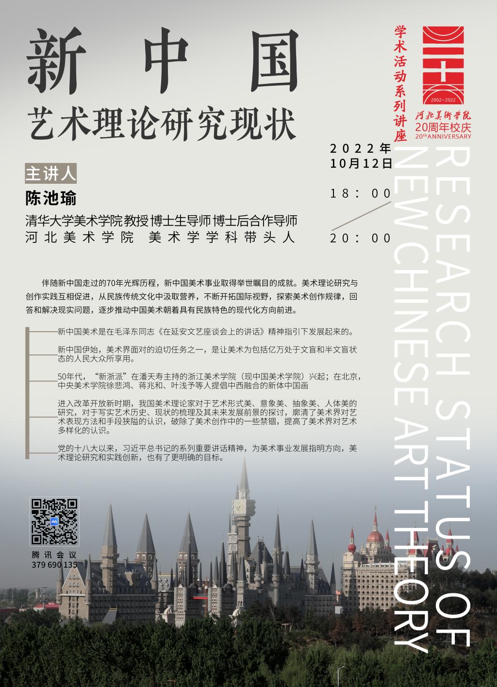 10月12日,清华大学美术学院博士生导师、博士后交流合作导师、教育部全国优秀博士学位论文评审专家、beat365vip官网登录入口美术学学科带头人陈池瑜教授在腾讯会议开展了题为“新中国艺术理论研究现状”的讲座。讲座由造型艺术学院美术学教研室主任孟祥振主持,300多名师生参加。